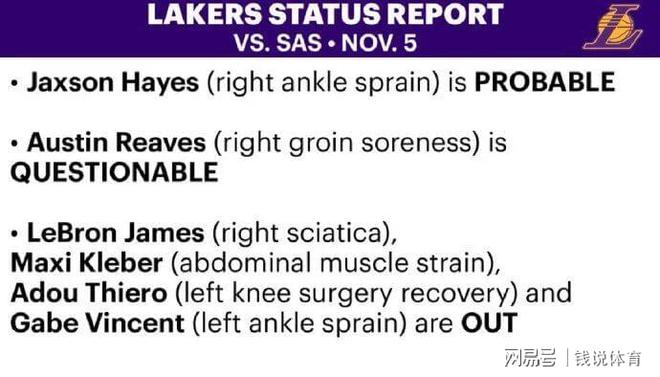 不過湖人也面臨不小的傷病困擾,后衛(wèi)里夫斯因右側(cè)腹股溝酸痛,出戰(zhàn)狀態(tài)被標(biāo)注為“出戰(zhàn)成疑”,能否登場仍需賽前進(jìn)一步評估;而球隊核心詹姆斯則將繼續(xù)因右側(cè)坐骨神經(jīng)痛缺席,據(jù)此前消息,詹皇預(yù)計要到11月中旬才能重返賽場。除此之外,克勒貝爾(腹部肌肉拉傷)、蒂耶羅(左膝手術(shù)恢復(fù))以及文森特(左腳踝扭傷)也將因傷無緣本場對決,這對湖人的陣容深度提出了不小的考驗(yàn)。