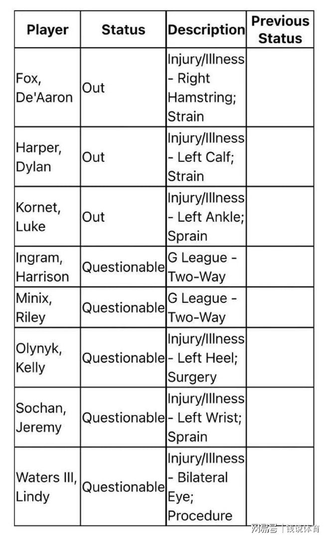 馬刺方面的傷病情況同樣不容樂觀,球隊已有3名球員確定缺席,分別是??怂?、榜眼秀哈珀以及科內(nèi)特,其中哈珀是新晉傷病球員,此次因左小腿拉傷無法登場,他的缺席將影響馬刺的年輕陣容輪換。更值得注意的是,馬刺還有5名球員處于“出戰(zhàn)成疑”狀態(tài),包括英格拉姆、米尼克斯、奧利尼克、索漢和沃特斯,這5名球員的出戰(zhàn)情況將直接決定馬刺本場的陣容厚度。