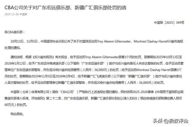 通知說明,根據(jù)《反興奮劑規(guī)則》有關(guān)規(guī)定,給予運動員Troy Akeem Gillenwater禁賽3個月的處罰、禁賽期自2025年10月13日至2026年1月12日,給予廣東宏遠華南虎俱樂部(以下簡稱“廣東宏遠俱樂部”)醫(yī)療與反興奮劑責任人林志達警告的處罰,給予運動員管理單位廣東宏遠俱樂部警告,并負擔20例興奮劑檢測費用(人民幣:36,000元)的處罰;給予運動員Montrezl Dashay Harrell禁賽3個月的處罰、禁賽期自2025年11月5日至2026年2月4日,給予新疆廣匯飛虎俱樂部(以下簡稱“新疆廣匯俱樂部”)醫(yī)療與反興奮劑責任人吳杰警告的處罰,給予運動員管理單位新疆廣匯俱樂部警告,并負擔20例興奮劑檢測費用(人民幣:36,000元)的處罰。