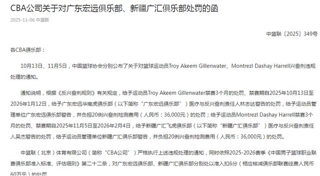 CBA官方:吉倫沃特哈雷爾興奮劑違規(guī) 廣東新疆扣6分核減經(jīng)費(fèi)60萬(wàn)