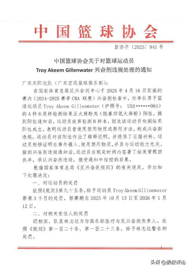 值得一提的是此前廣東大外援吉倫沃特的情況也比較類似,吉倫沃特遭到禁賽三個(gè)月,廣東東陽光隊(duì)(廣東宏遠(yuǎn)籃球俱樂部)作為管理單位受到了警告及負(fù)擔(dān)20例興奮劑檢測費(fèi)用(人民幣36000元)的處罰,該單位的醫(yī)療與反興奮劑負(fù)責(zé)人、隊(duì)醫(yī)林志達(dá)被給予警告處罰。