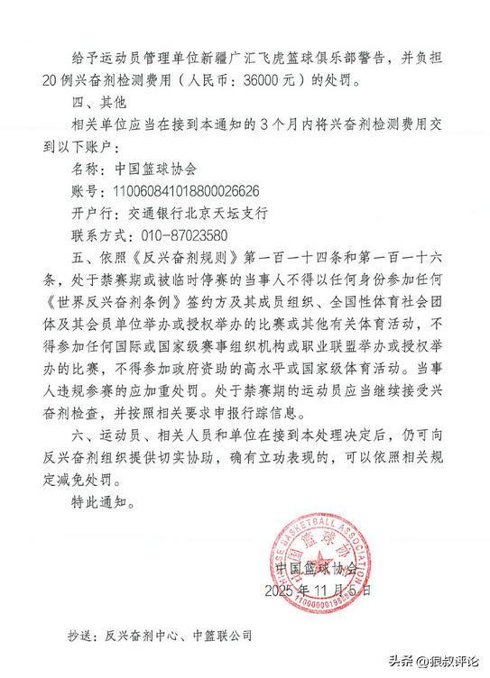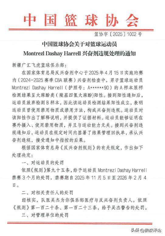 北京時(shí)間11月6日,根據(jù)中國籃協(xié)官方社媒公示,對于上個(gè)賽季新疆外援哈雷爾事件開出罰單,禁賽3個(gè)月,以及新疆俱樂部承擔(dān)36000元的檢測費(fèi)用。