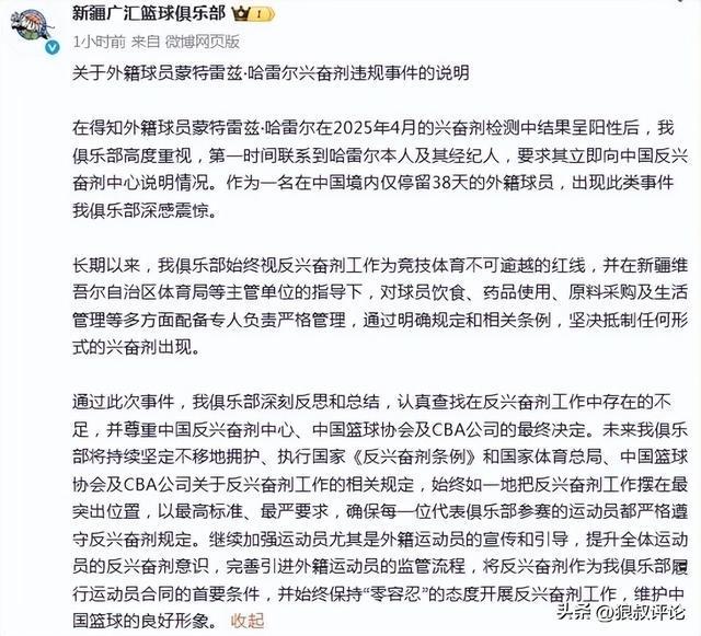 此前,新疆男籃官方也提到了哈雷爾在中國境內(nèi)僅停留38天,出現(xiàn)此類事件我俱樂部深感震驚。