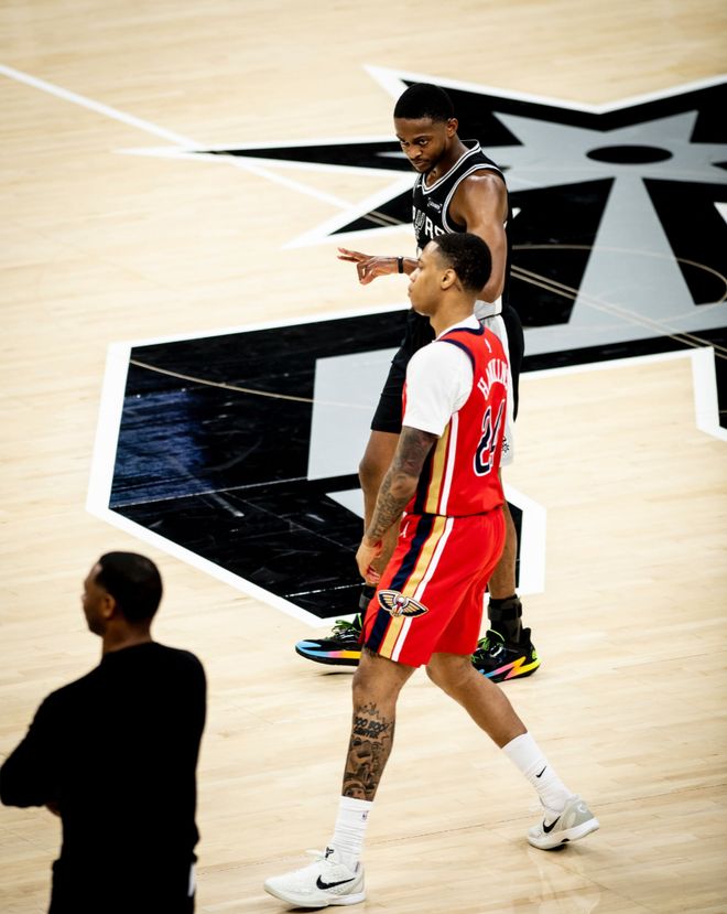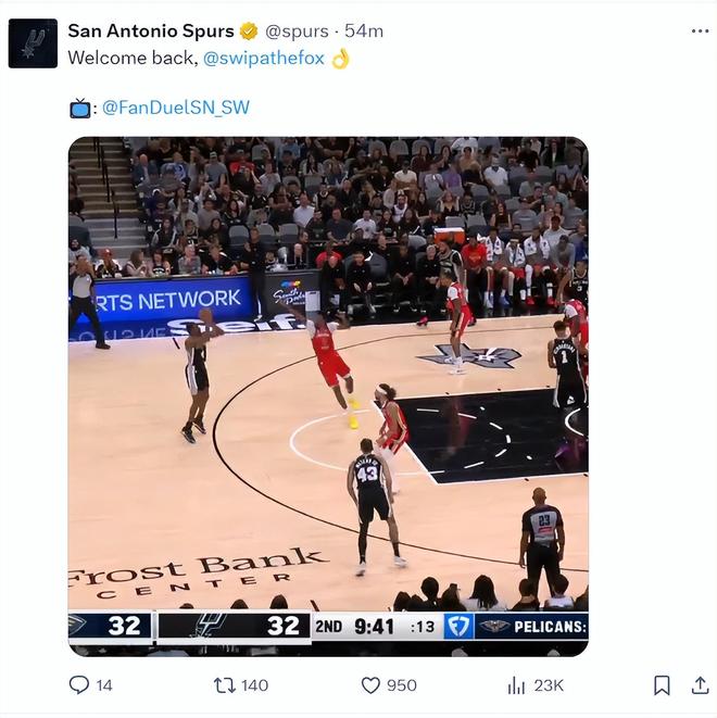 ??怂故坠?jié)是2中0,他第二節(jié)才完成第一個運動戰(zhàn)三分,馬刺官方也歡迎他歸來。