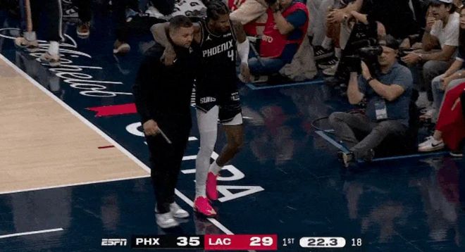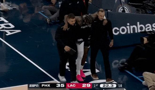 北京時(shí)間11月9日,在太陽客場(chǎng)對(duì)陣快船的比賽,太陽新援杰倫-格林在復(fù)出第二場(chǎng)再次受傷。格林首節(jié)疑似出現(xiàn)右大腿腿筋拉傷情況,隨后被隊(duì)醫(yī)攙扶返回更衣室。