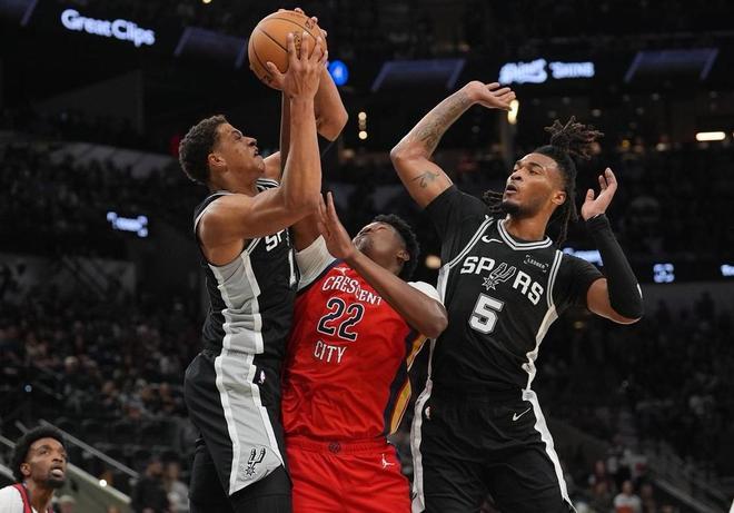 另一邊的鵜鶘隊,2勝6負排名西部倒數(shù)第2,本賽季基本上是擺爛的節(jié)奏了,兩大得分核心錫安,普爾,相繼受傷,另一個全明星后衛(wèi)穆雷也還沒復出,不知道鵜鶘這個地方,是不是風水有問題。本場比賽,雙方在首發(fā)陣容上面,鵜鶘這邊派出的是,費爾斯,墨菲,瓊斯,薩迪克貝和盧尼,馬刺這邊派出的是,??怂?,卡斯爾,瓦塞爾,巴恩斯和文班亞馬。首節(jié)比賽開始,馬刺率先拿到球權(quán),瓦塞爾三分線外直接開花,打進本場比賽首個進球,文班亞馬拉弓暴扣輕松打進,墨菲手腕一抖的補籃命中幫助鵜鶘開張,文班再掄起雙錘,來一個毀滅暴扣。